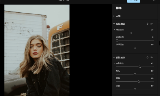 3、应用了预设后,可以打开Luminar Neo的编辑工具,对预设效果进行微调。比如人像,可以用“画像”类工具,进一步调整脸部、皮肤的细节,以达到瘦脸、磨皮等效果。如果对效果比较满意,可以将修改后的参数保存为“我的预设”。