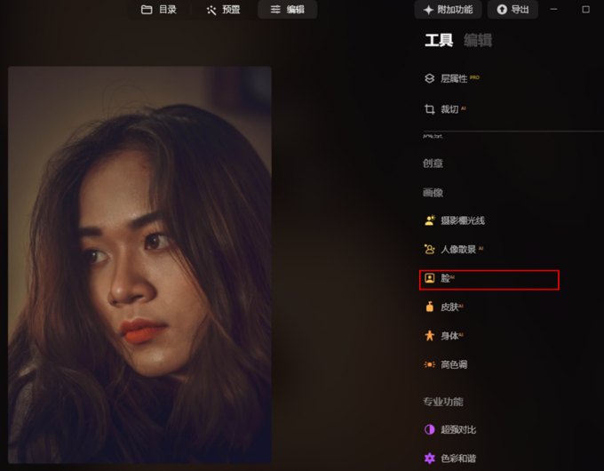 1、Luminar Neo有AI瘦脸的功能,我们可以先给人像瘦一下脸再去双下巴,这样修图会简单一些。如图1所示,在右侧的画像工具中,打开“脸AI”功能,其中会包含“脸灯”与“苗条的脸”两个参数。