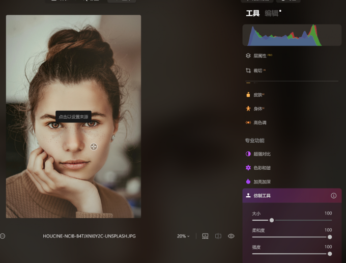 2、对于这些残留的瑕疵,就需要手动精修。进入专业功能里的【仿制工具】,画面会提示点击以设置来源,意思是先选取一个干净的皮肤区域作为复制源。可以在斑点附近找一块肤色接近、质感自然的位置点一下,再把画笔缩小,用好的皮肤一点点覆盖斑点位置。