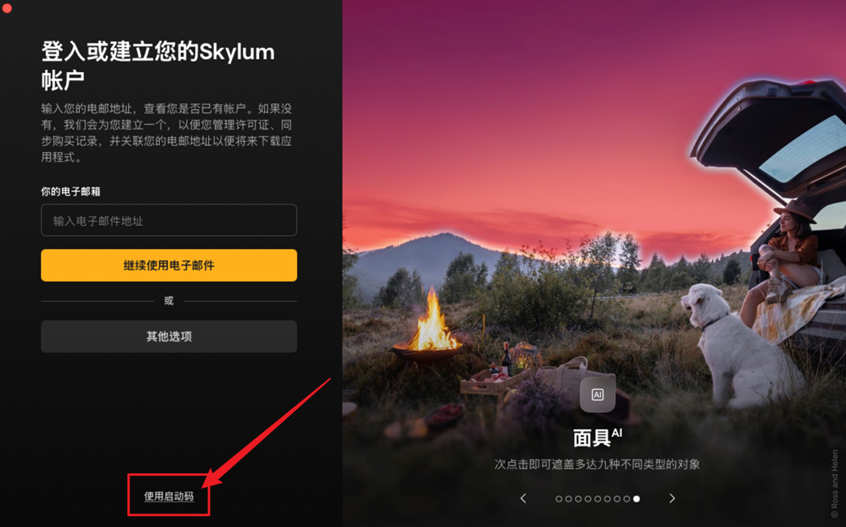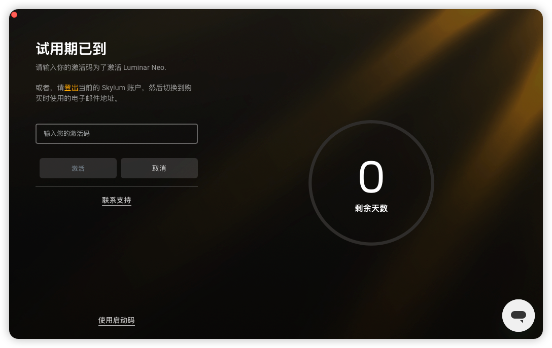 五、安装完成后,在登录激活界面输入邮箱,如果之前没有注册过账号则会自动注册。然后点击下方的激活码(启动码),点击激活,即可完成Luminar Neo国际版的软件激活。