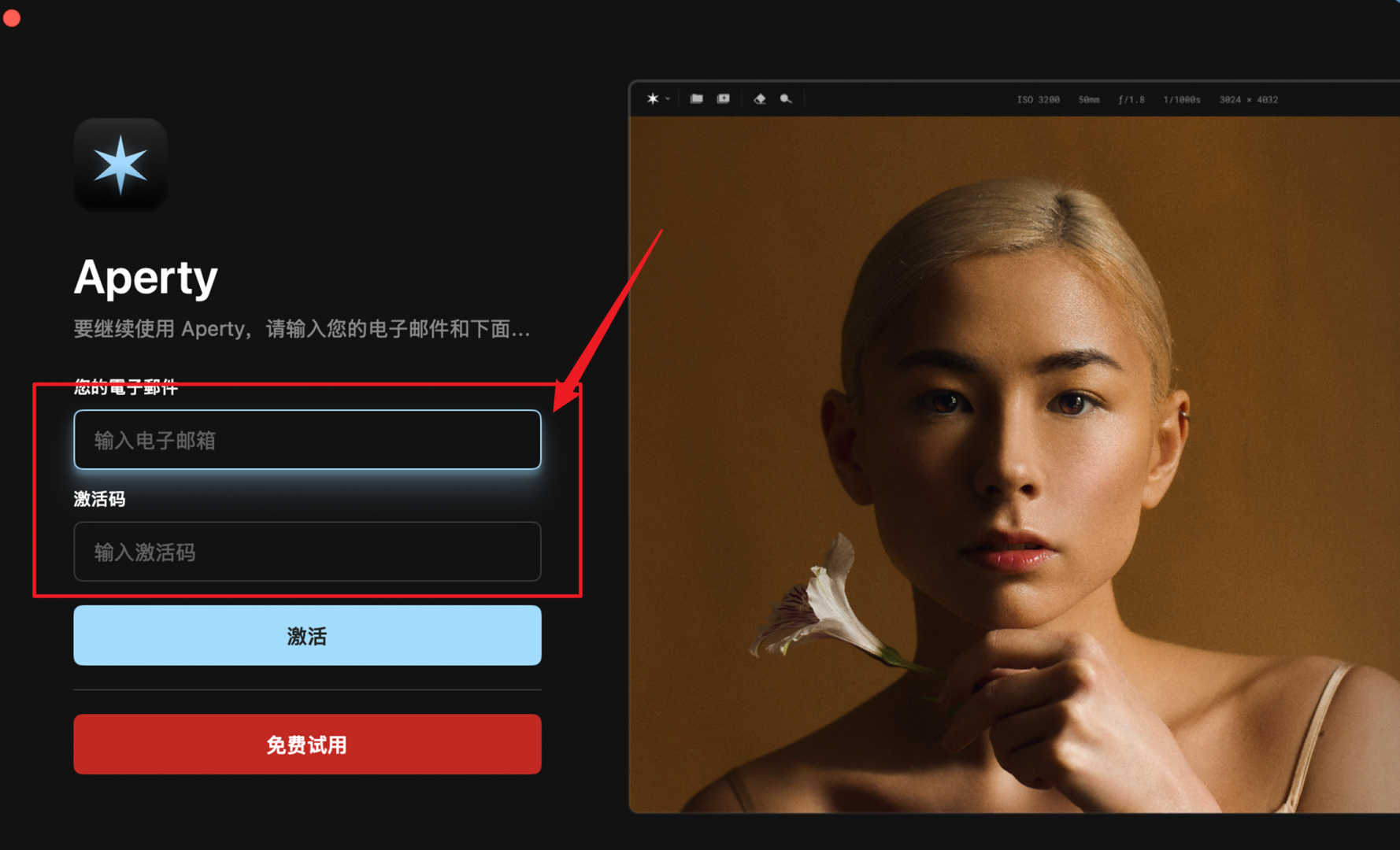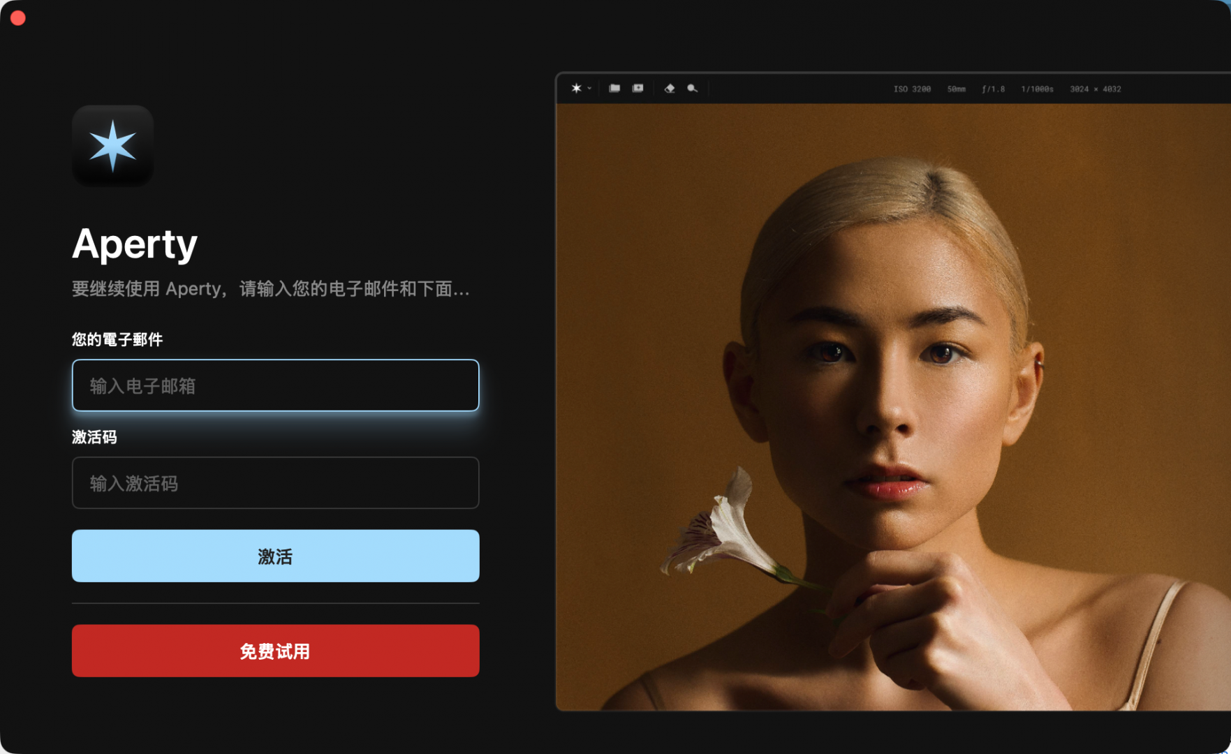 感谢您对AI修图软件Aperty的支持,Aperty为您提供了14天免费试用,相信Aperty能在您日后的使用中大大提高您的修图效率;接下来让我们看看如何进行试用激活吧。